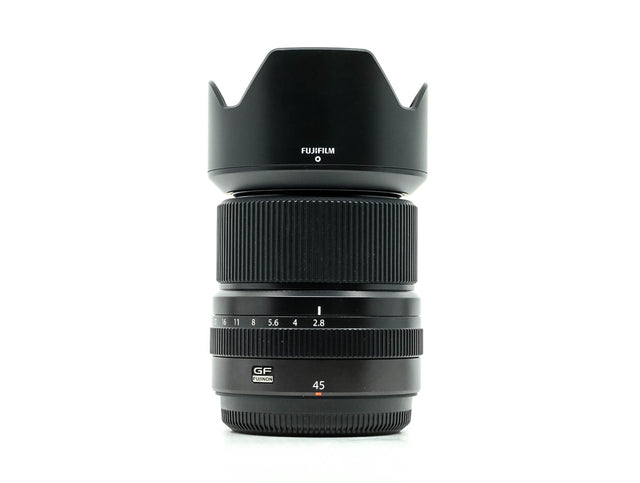 The Fujifilm GF 45mm f/2.8 R WR is a 36mm equivalent lens for the G-mount GFX camera system. With a slightly wider-than-normal field of view, this lens is ideal for everyday shooting and its f/2.8 maximum aperture suits working in difficult lighting conditions. Its optical design incorporates one aspherical element and two extra-low dispersion elements to reduce both spherical and chromatic aberrations for improved sharpness and clarity. A Nano GI coating has also been applied to individual elements to suppress lens flare and ghosting for greater contrast and coluor accuracy. Contributing to its flexibility, the lens also features a dust-, freeze-, and weather-resistant construction for use in inclement conditions. Additionally, a manual aperture ring is featured for intuitive, tactile adjustment over exposure settings, and a Command position can also be set for camera-based control over the aperture.