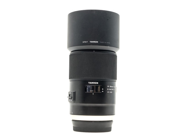 The Tamron SP 90mm f/2.8 Di VC USD Macro, EF Fit (F017) is a short telephoto prime designed for full-frame Canon EF-mount DSLRs. Offering a life-size maximum magnification ratio of 1:1, this lens benefits working with small and nearby subjects and employs a Floating System for maintained image quality throughout the 11.8" to infinity focusing range. One Low Dispersion and two Extra Low Dispersion glass elements are incorporated into the optical design to minimize chromatic aberrations and color fringing for clean, consistent sharpness and clarity throughout the magnification range. BBAR and eBAND coatings have also been applied to minimize flare and ghosting for increased contrast when working in strong lighting conditions, and a rounded nine-blade diaphragm contributes to a pleasing bokeh quality to benefit shallow depth of field imagery. As an update to the classic 90mm macro, this enhanced version is well-suited to the high-resolution crop of DSLRs and blends timeless appeal and functionality with current imaging performance.